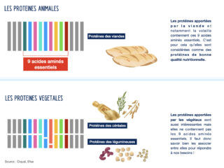 Plusieurs aliments nous apportent des protéines : la viande, le poisson, les œufs, les produits laitiers mais aussi les légumes secs (pois chiches, lentilles, haricots …), les céréales (blé, riz…), le tofu….