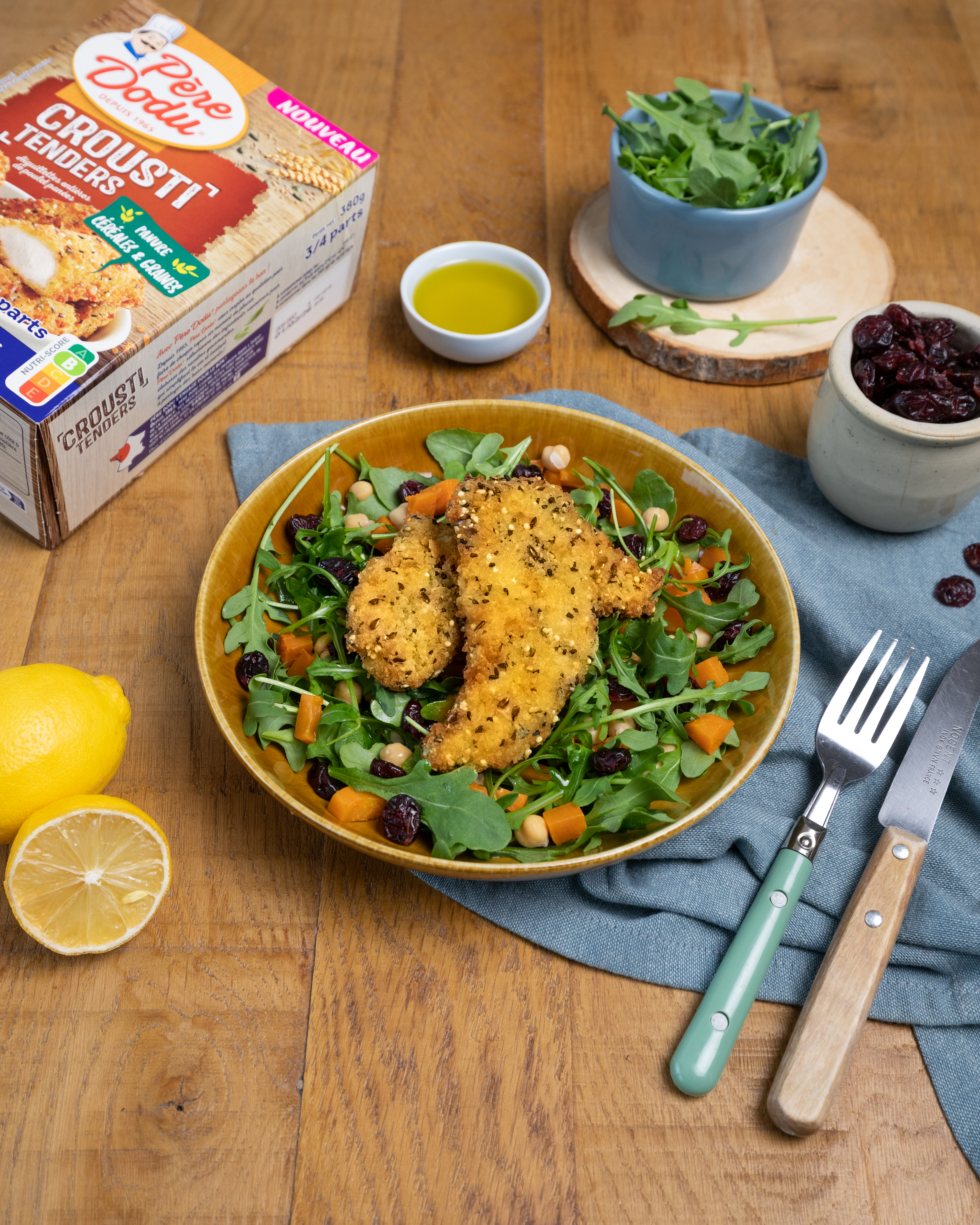 Crousti Tenders Graines et céréales et salade de patate douce, roquette, et pois chiche