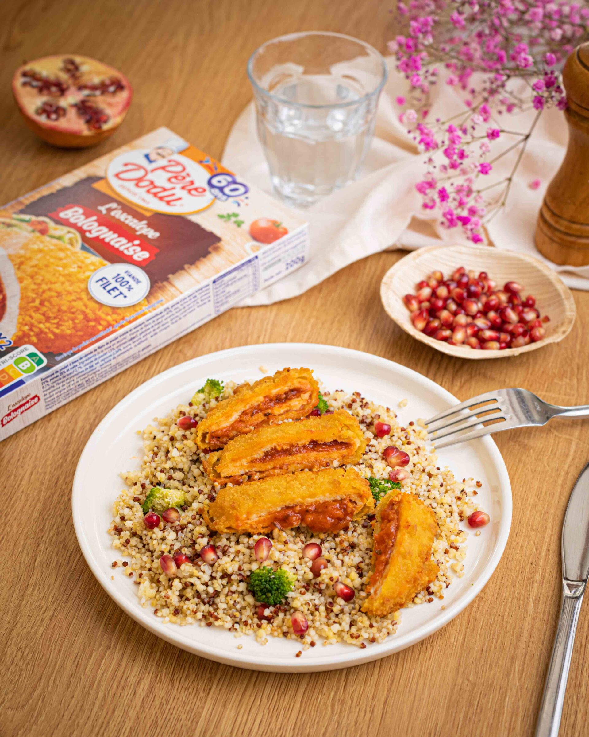 - Assemblage : quinoa, brocolis, vinaigrette, parsemez de graines de grenade et ajoutez l’escalope coupée en lamelles.