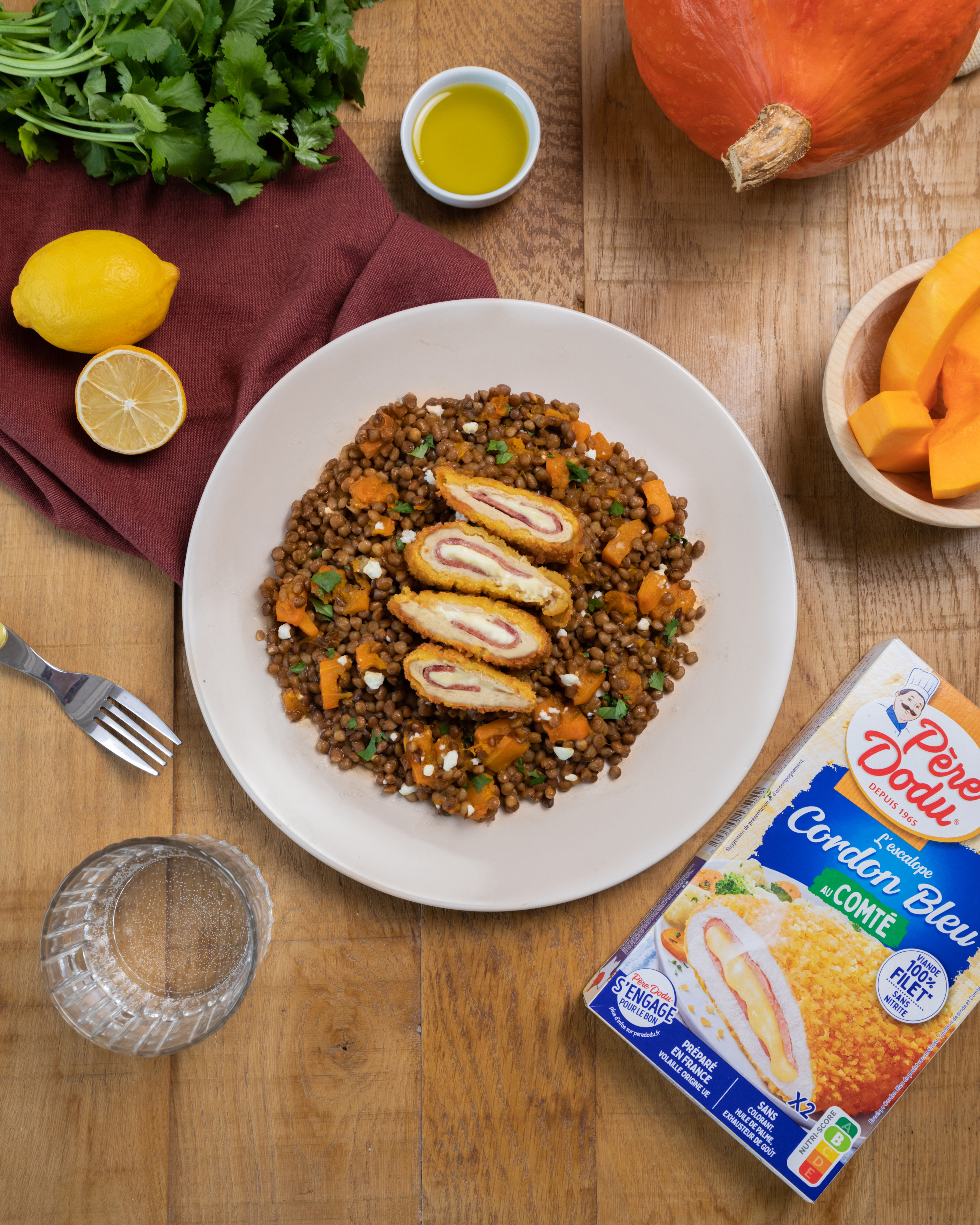 Escalope Cordon Bleu Comté & Salade de lentilles, potimarron
