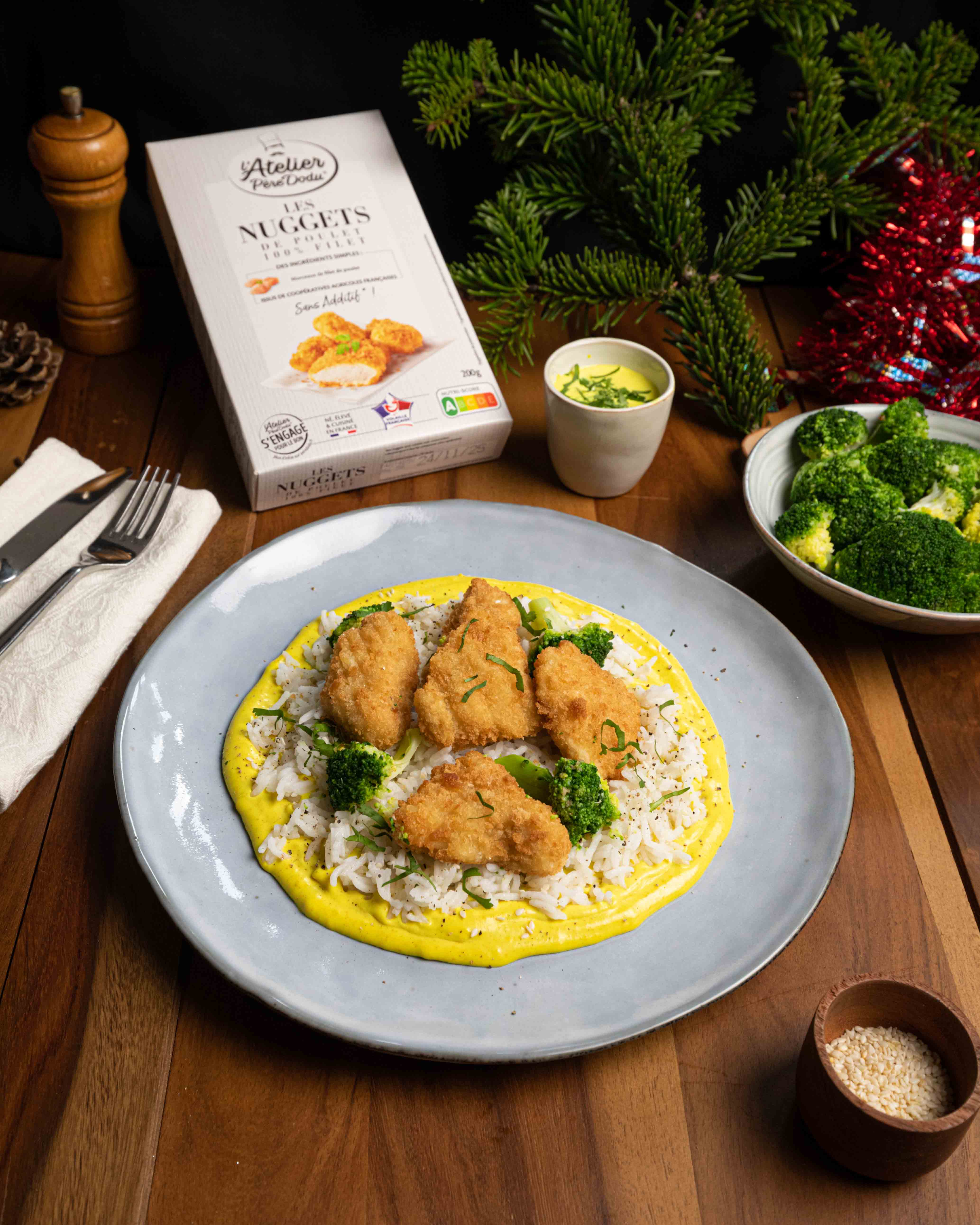 Riz, brocolis rôtis, nuggets et sa sauce coco