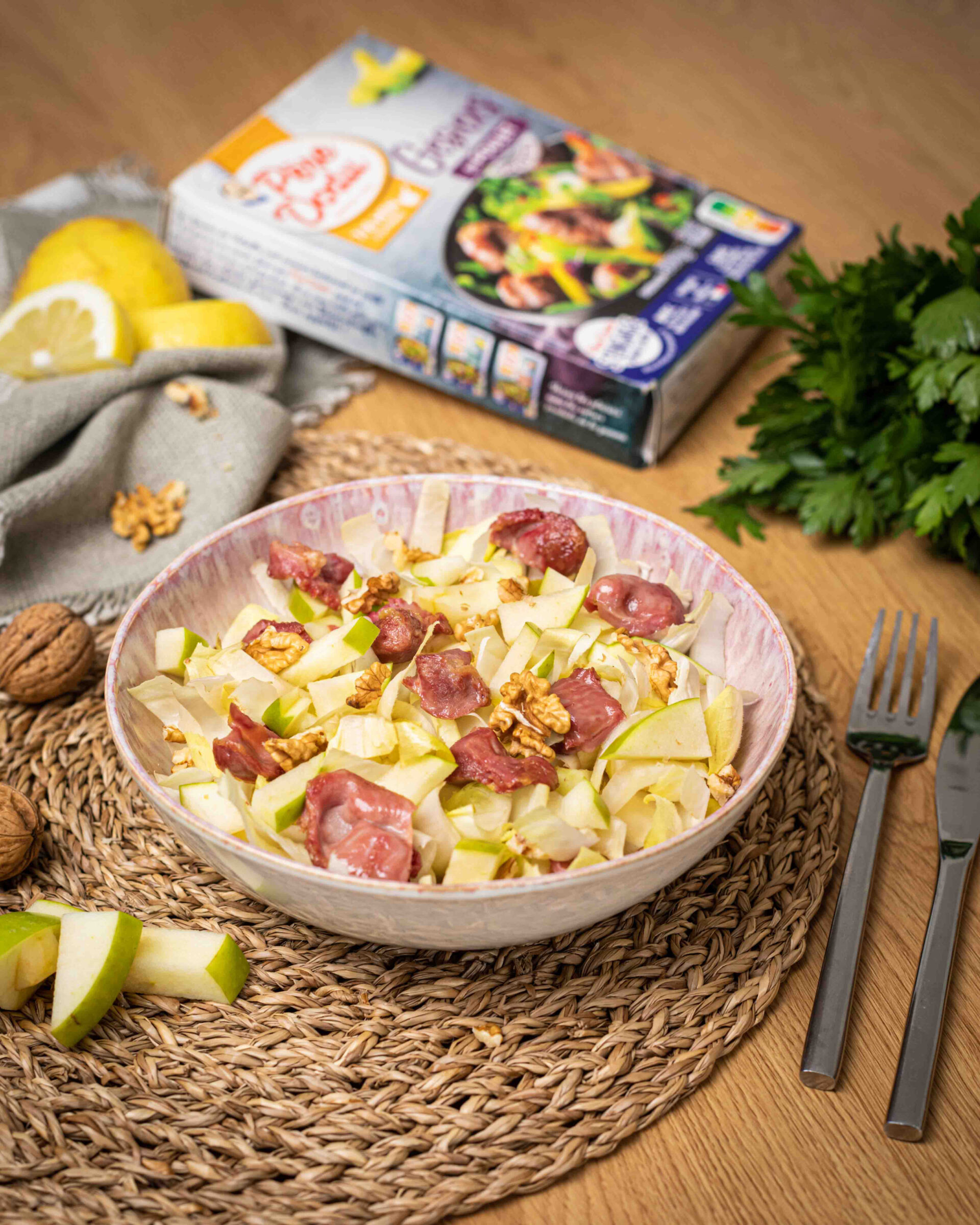 - Émincez les endives en fines lamelles et déposez-les dans un saladier.