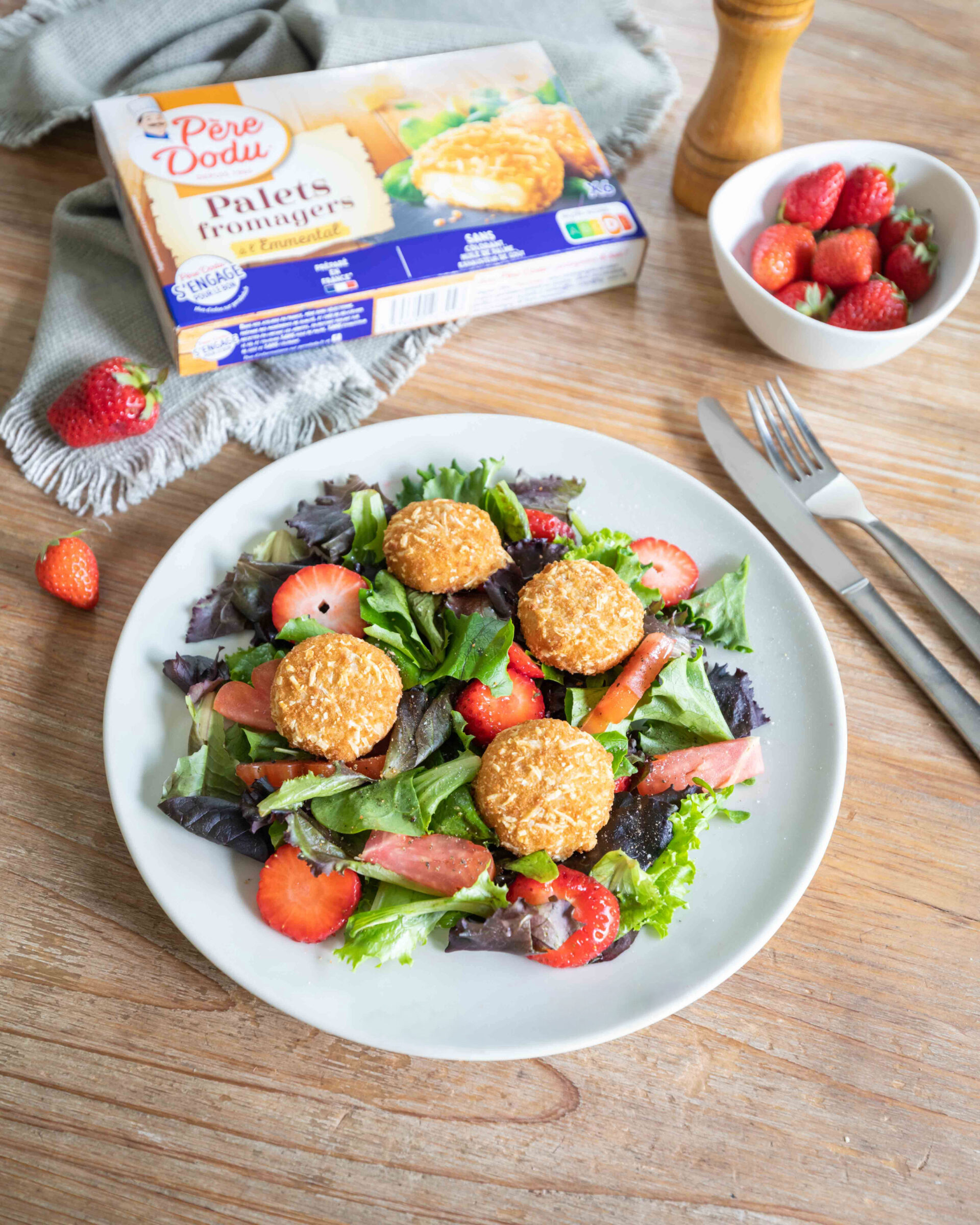 - Assemblez le tout, versez la sauce, ajoutez les Palets Fromagers chauds par-dessus, et servez !