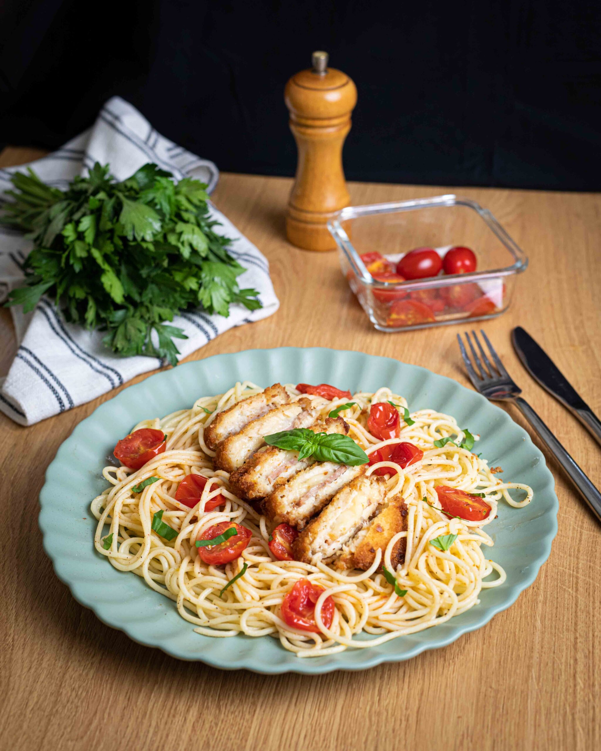Spaghetti tomates cerises basilic et cordon bleu Atl.