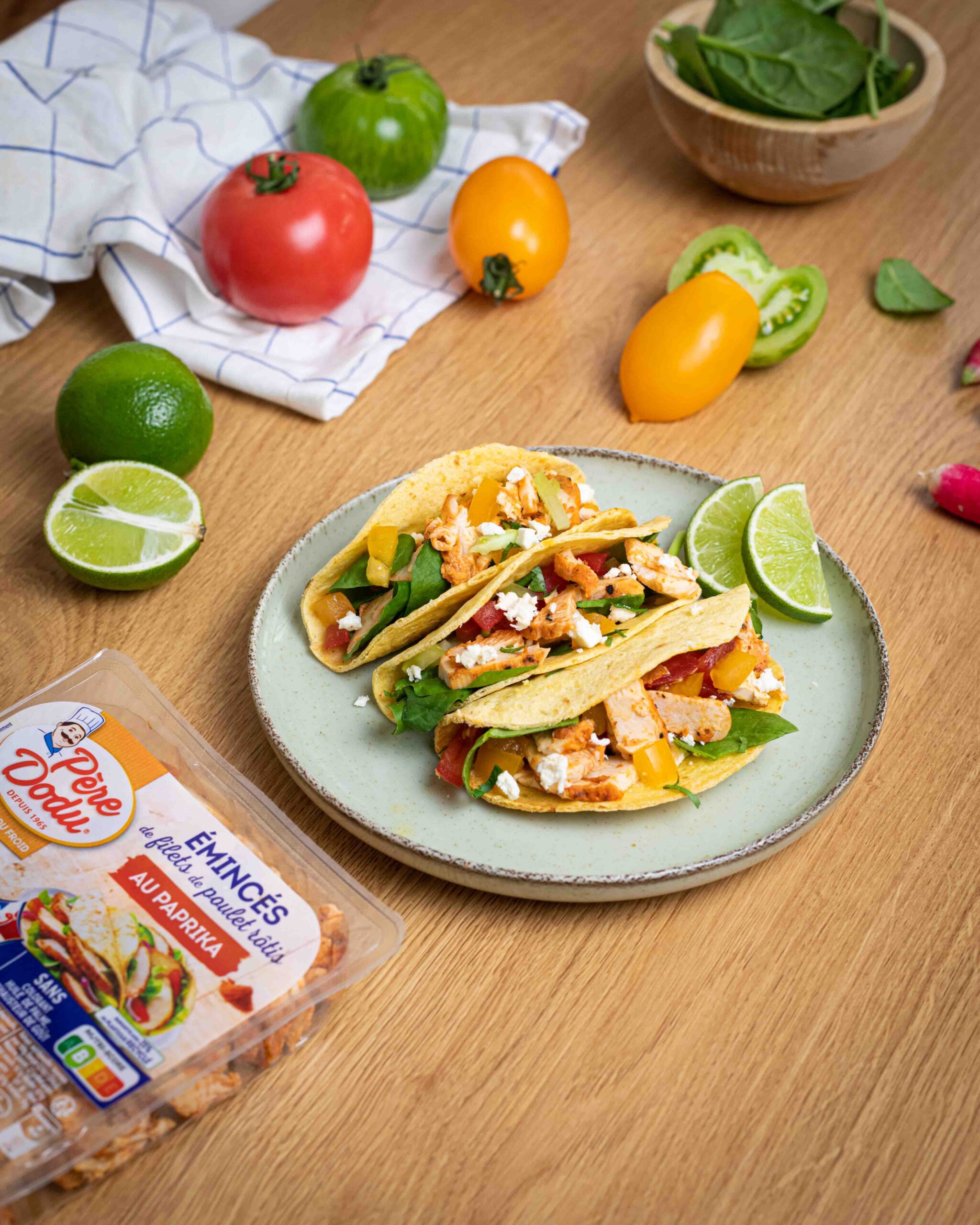 - Répartissez dans les tortillas la salade, les tomates, la feta et les émincés de poulet.