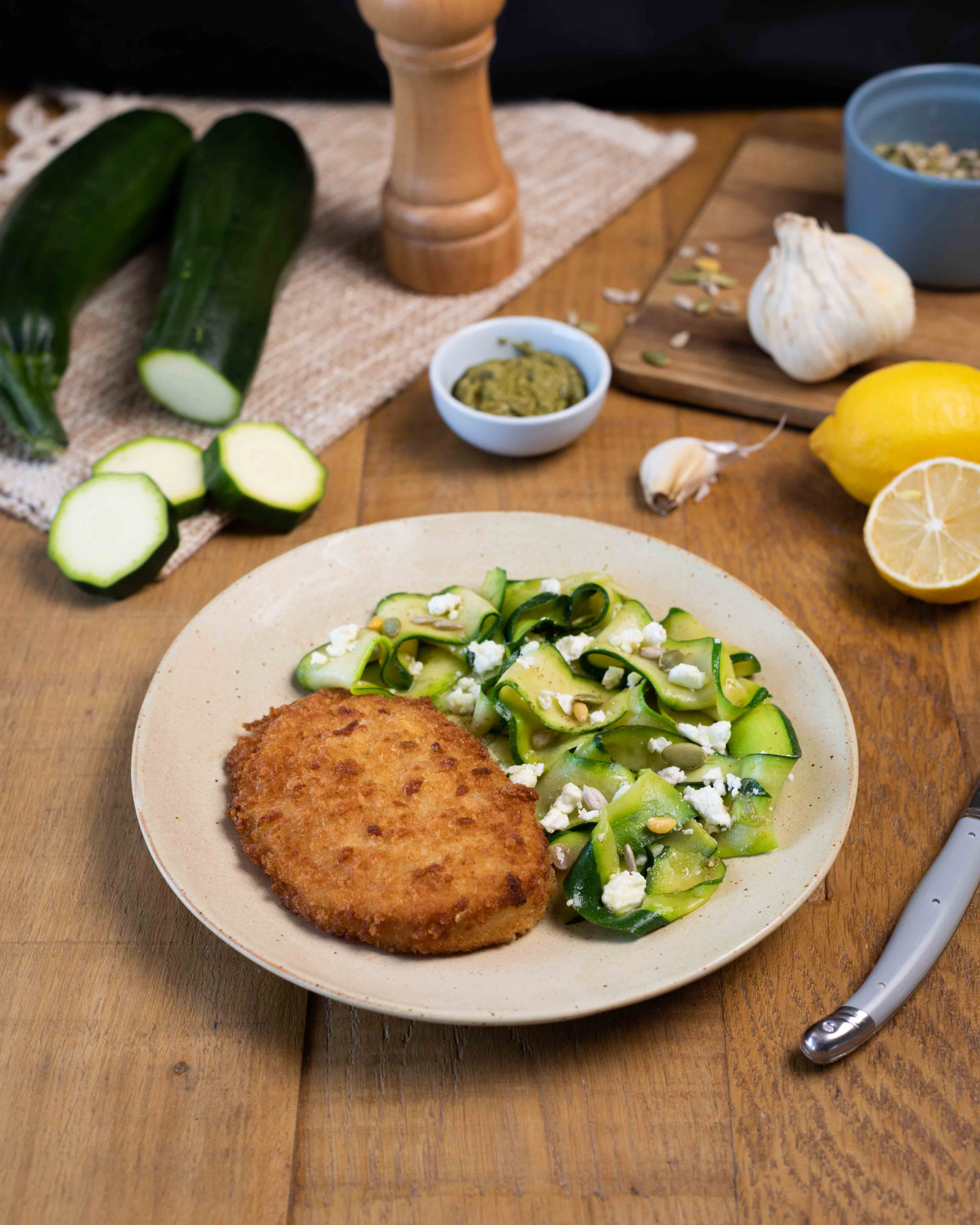Tagliatelles de courgettes pesto, féta et Escalope Cordon Bleu l'Atelier Père Dodu